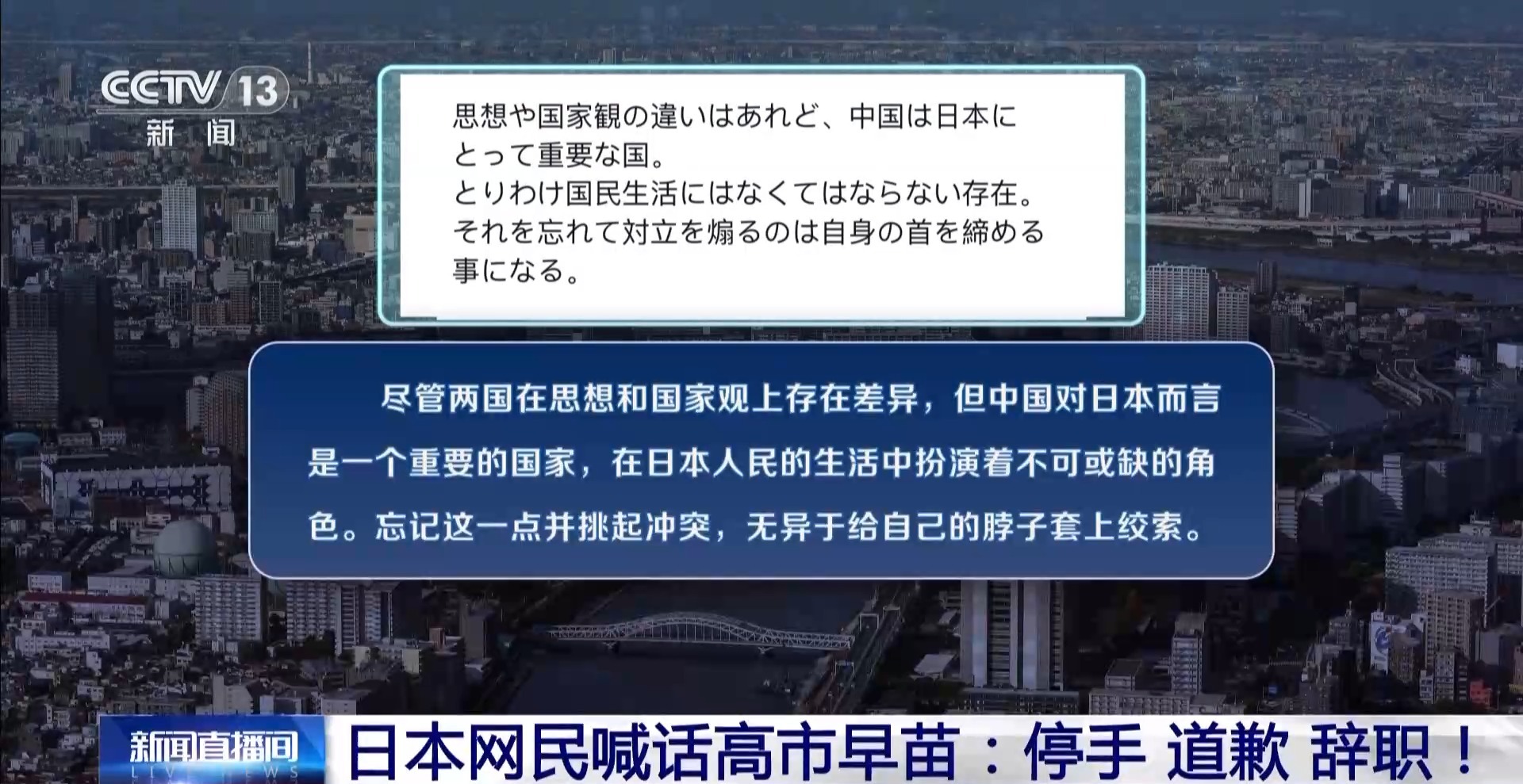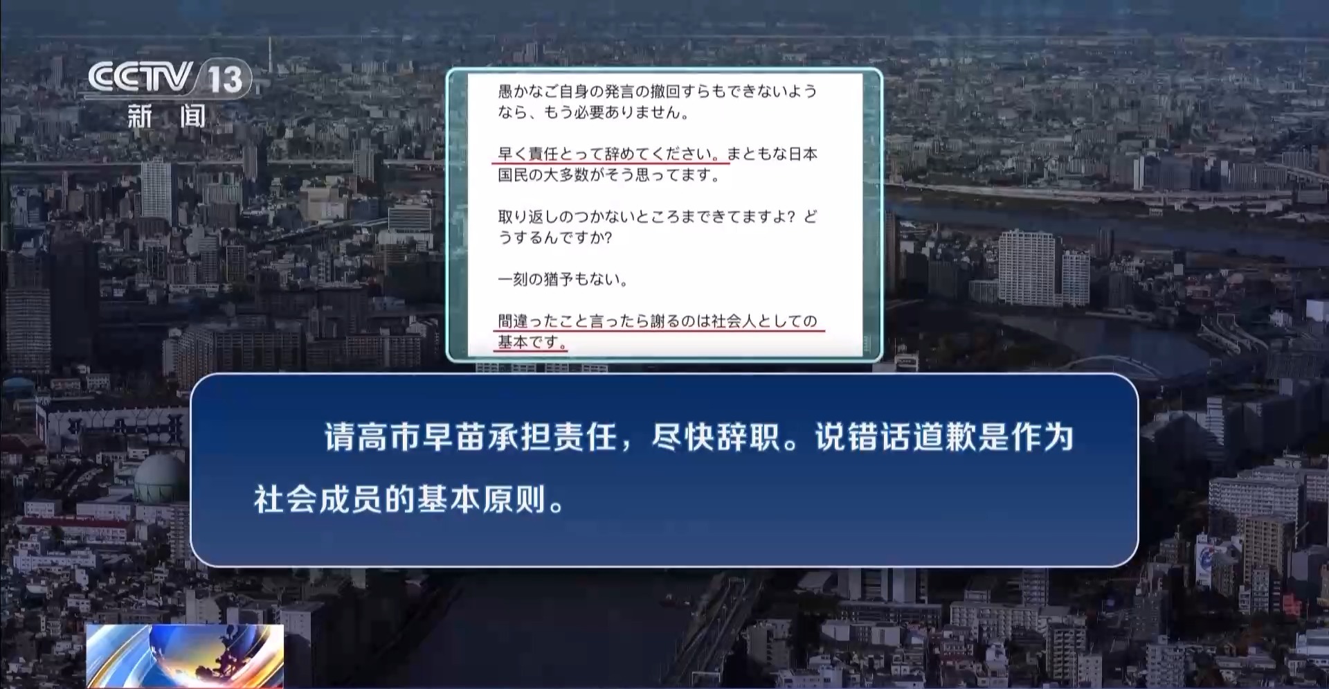 一位网友发帖称,“请高市早苗承担责任,尽快辞职。说错话道歉是作为社会成员的基本原则。”