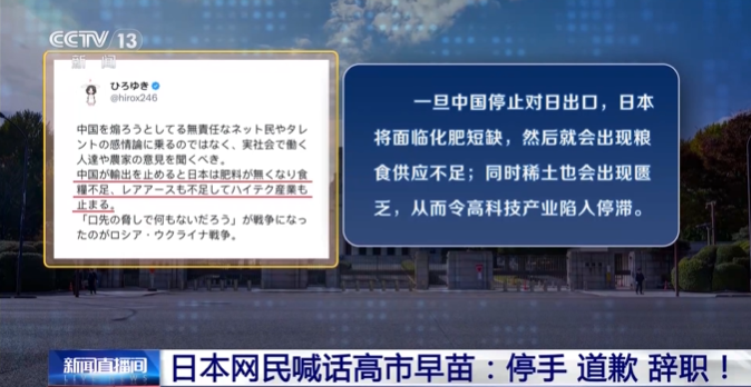 一名在社交网络上拥有260万粉丝的日本博主发文,斥责那些因高市早苗惹得中国震怒而兴奋的日本右翼,认为他们并不了解日本的企业和农民所面临的现实。他写道,“一旦中国停止对日出口,日本将面临化肥短缺,然后就会出现粮食供应不足;同时稀土也会出现匮乏,从而令高科技产业陷入停滞。”