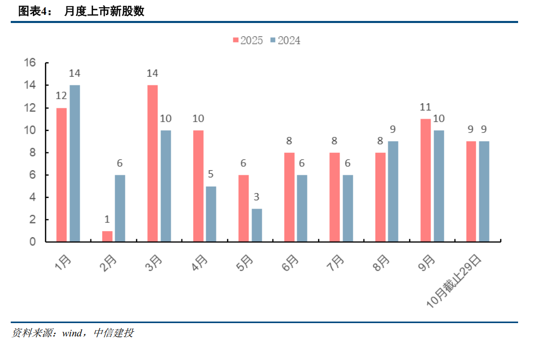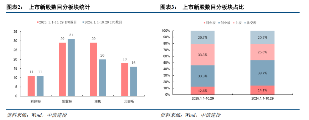 2025年以来IPO数量同比有所回升。截至2025年10月29日,沪深北交所共上市87家新股,较去年同期增加9家。其中科创板、创业板、主板及北交所上市新股数分别为11家、29家、29家、18家,分别较去年同期持平、-2家、+9家、+2家,可见今年上市数量回升体现在主板和北交所,而创业板反而较去年上市数量下降。从各个板块新股占比来看,主板上市数量比例由去年的25.6%提升至33.3%,而创业板上市数量比例分别由去年的39.7%下降至33.3%。