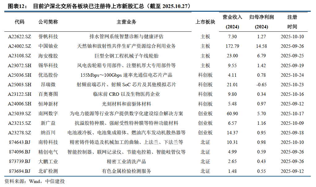 注册方面,截至10月29日,今年以来沪深北交所共有74家新股完成注册,其中有15家已注册新股尚未上市,含主板标的4家、科创板标的4家、创业板标的3家、北交所标的4家。去年期间,已注册新股尚未上市数量基本都保持在25-30家左右,今年有所下降,也反映出今年上市效率有所提升。