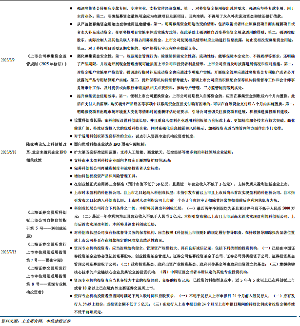 科技型未盈利新股方面,科创板未盈利企业试点差异化配售在今年年初即推进。1月3日,上交所就《上海证券交易所首次公开发行证券发行与承销业务实施细则(征求意见稿)》公开征求意见,主要针对科创板未盈利企业,规定可以采用约定限售方式。3月28日,上交所发布《上海证券交易所首次公开发行证券发行与承销业务实施细则(2025年修订)》,明确未盈利企业可以采用约定限售方式,对网下发行证券设定不同档位的限售比例或限售期。公募基金、社保基金、养老金、年金基金、银行理财产品、保险资金、保险资产管理产品和合格境外投资者资金可以自主申购不同限售档位的证券,其他投资者按照最低限售档位自主申购。此举有望提高有长期持股意愿投资者的配售比例,让科技创新企业上市募资选择上更加灵活。