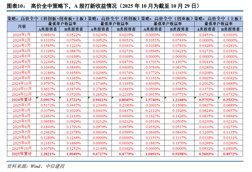 截至10月29日,由于今年以来新股首日涨幅同比提升,以及上市数量有所回升,因此我们测算询价制打新收益较去年亦有改善,1月-9月中仅2月、6月、8月的单月打新收益低于去年。上半年受中签率下降和首日涨幅逐月下降的影响,询价制打新收益率呈现逐月下降的趋势,但随着6月中旬以来首日涨幅触底回升,打新收益亦同步回升。今年以来截至10月29日,我们测算在高价全中策略下,A、B类账户(2亿规模假设,含主板,按收盘价计)累计打新收益分别为2.2821%、1.9049%。