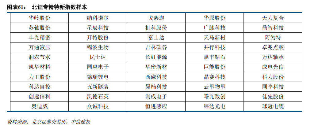 新指数有望带来显著被动资金增量。相较北证50指数,专精特新指数更加突出“专”和“小”两个特征,编制方法专门提出将新上市且市值居于板块龙头地位(前五名+发行超百亿)的次新股也纳入样本空间,有助于提高板块对体量较大的专精特新企业的吸引力。对比专精特新指数成分股名单和北证50指数成分股名单,存在27只重叠标的;新指数设立将为其余专精特新标的带来显著被动资金增量。