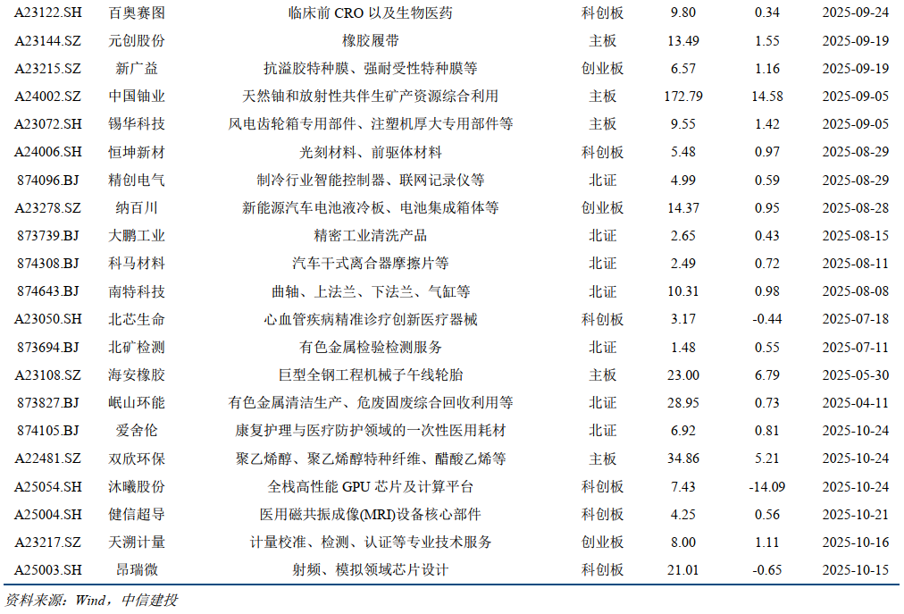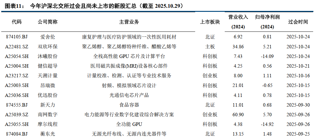 从过会情况来看,截至10月29日,2025年沪深北交所累计IPO过会57家,较去年同期大幅增加25家,其中31家公司已经上市,尚有26家公司未上市。今年至今过会数量同比去年明显提升,一方面反映去年上市企业主要聚集于推进过会后排队较久的IPO流程,经过此过程后,IPO存量池的情况已明显缓解,叠加今年陆家嘴论坛后推进科技型新股预先审阅,加快上市效率,因此过会数有所提升;另一方面,北交所过会数有所增加,截至10月29日,今年北交所过会22家,去年同期为14家,北交所扩容也在持续准备和推进过程中。