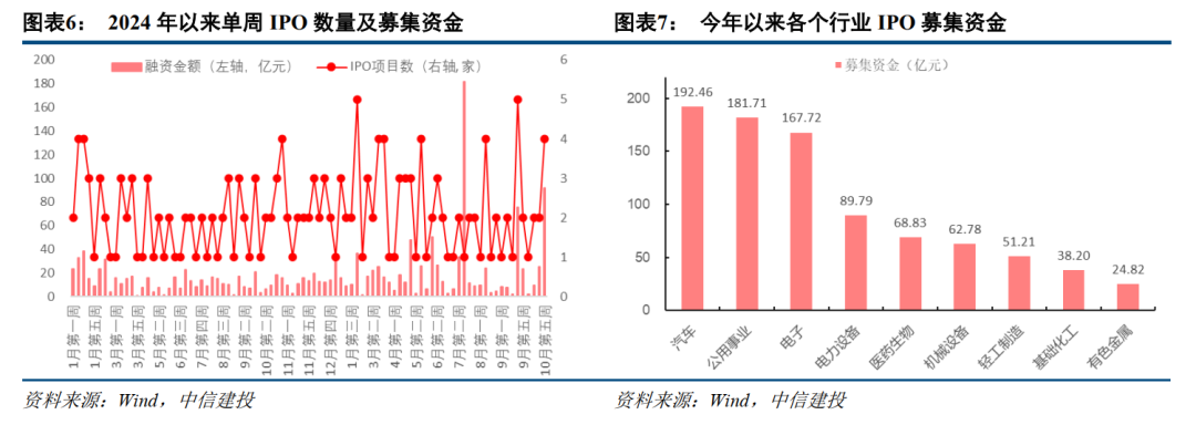 细分行业来看,今年汽车、电子、电力设备、机械设备行业IPO募资金额较多,其中汽车行业共募资192.5亿元,电力行业共募资167.7亿元。电力设备、机械设备行业分别共募资89.8亿元、62.8亿元。此外,公用事业行业仅华电新能一家新股上市,但其上市规模庞大,合计募资达181.7亿元。