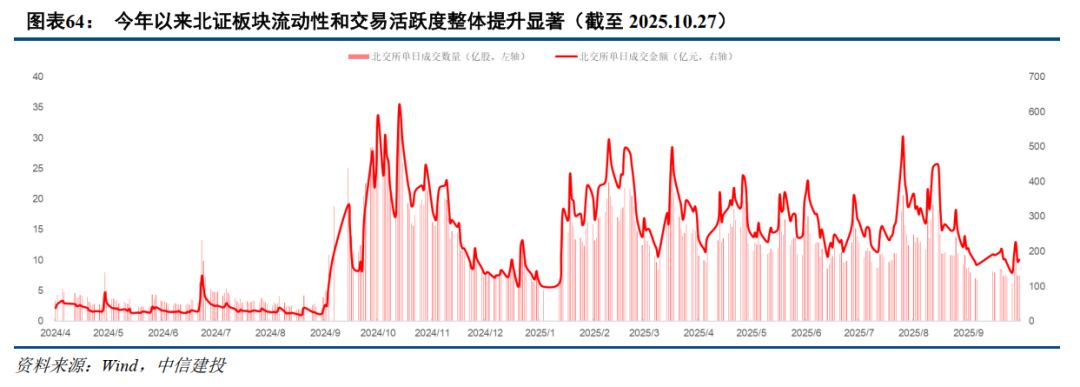 从流动性看,9.24政策利好持续释放,今年以来北证板块整体流动性显著提升。截至10月27日,今年北证总成交额5.53万亿元,较去年同期大幅提升273.65%;今年单日日均成交额283.58亿元,而去年全年日均成交额为122.88亿元。