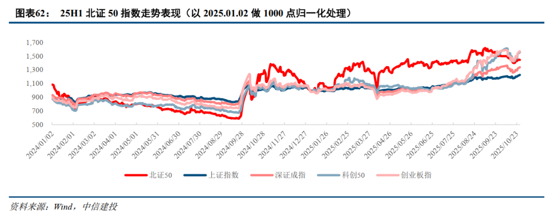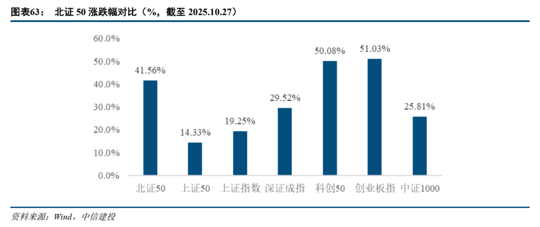 2025年以来截至10月27日,北证50指数累计涨幅41.56%,领先于同期上证50、上证指数、深证成指、中证1000的涨幅,落后于同期科创50和创业板指涨幅。今年北证在主要板块指数中涨幅较好,尤其在1-7月领涨所有版块,8月沪深大盘开始上涨势头后,北证50有所回落。
