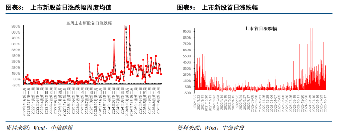 从上市表现看,去年9.24新政后,资本市场整体回暖,带动新股首日涨幅开始显著提升,今年整体维持首日高涨幅的趋势,截至10月29日尚无破发新股,新股“赚钱效应”持续凸显。具体来看,今年截至10月29日上市87家新股的IPO首日平均涨幅为244.78%,较去年同期78家新股的上市首日平均涨幅(212.71%)提升32.06pct,显示出今年延续去年后期新股首日高涨幅的趋势。