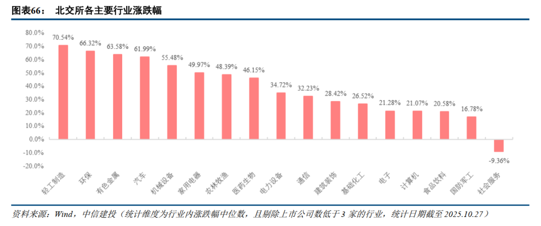 截至10月27日,北交所主要行业在2025年内普涨,但涨跌幅分化程度有所缩窄。涨幅居前的行业分别为轻工制造(+70.54%)、环保(+66.32%)、有色金属(+63.58%);涨幅较为靠后的行业分别为食品饮料(+20.58%)、国防军工(+16.78%)、社会服务(-9.36%)。