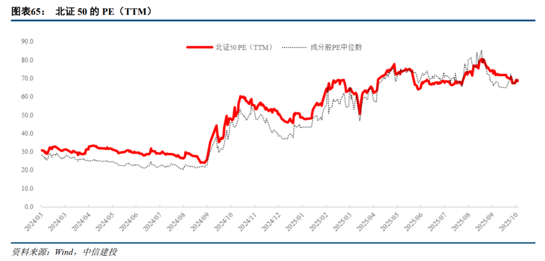 目前北证50指数估值持续处于历史较高分位。截至2025年10月27日,北证50指数的PE(TTM)为67.66X,位于板块历史估值的88.33%分位,处于历史较高位置。尤其是上半年北证板块估值基本处于历史最高分位,8月下旬开始板块有所回调后,估值历史分位数有所下降。自9.24以来,北证50指数的估值中位数是65.35 X,当前指数估值长期高于9.24以来的中位估值。
