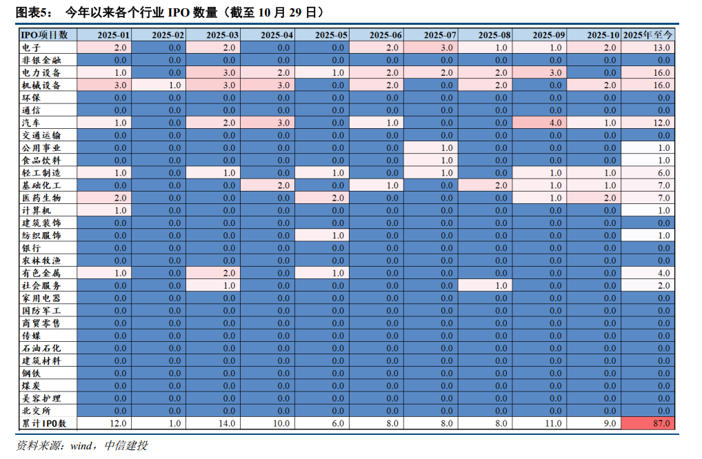 行业角度看,今年机械设备、电力设备、电子、汽车行业IPO数量较多。截至10月29日,机械设备和电力设备行业各有16家新股上市,电力行业13家新股上市,汽车行业12家新股上市。